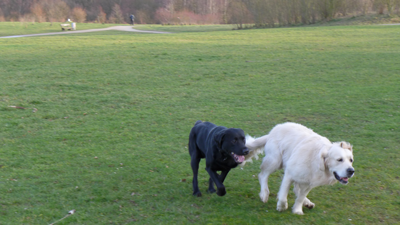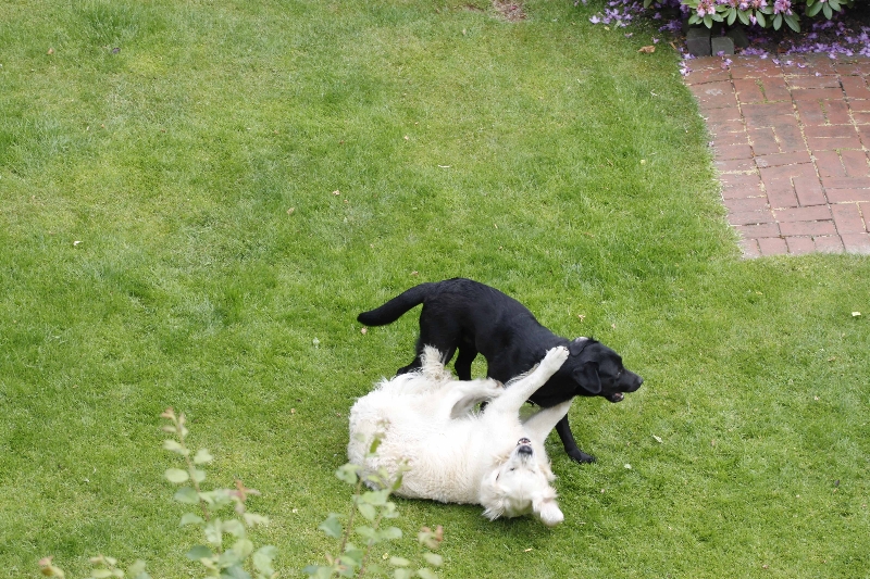 Wenn wir uns treffen, geht die Post ab. Meistens gehen dann unsere beiden Groß-Herrchen und die drei Klein-Herrchen mit uns stundenlang durch den Wald spazieren. Ich bin schon total stolz, dass ich den großen Pascha im Kampf schon manchmal besiegen darf!